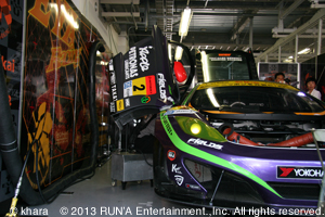 意外に爽やかな夏空で迎えた土曜日、練習走行と、ノックダウン予選。1000kmレースとはいえ、練習走行はいつものレースと変わらぬ、500クラス、300クラス混走100分+それぞれ占有10分の延べ110分。だが3人体制の我々にとっては、決して十分な時間ではない。 ベースセットを決めるべくコースインした加藤選手、タイヤ選定・・・といっても二者択一で、予選用タイヤ(=実質決勝スタートタイヤ)を決めなくてはならない。最初の4周計測のベストは2′04″782・・・11番手タイムだが、既に上位は03秒台・・・タイヤを代え3周計測では04″325のベスト更新!だが15番手。04秒台では上位に食い込めるタイムでは無く、トップ61号車、唯1台の01秒台は“別格”としても、03秒台は予選Q1突破には必須である。 足回りのセットアップも行いところだが、ノーマルサスの形式をベースとするFIAGTマシンはどうしてもそれらに時間がかかってしまう。・・・2人ドライバーの走行時間を考えると多くの周回を費やすこともできない。 そんな中、まず車高を調整し計測するも05秒台・・・やはりキャンバー調整も必要か・・・走行時間も貴重だが、このままではジリ貧となってしまう。今の我々には、安全策より打開策の方が重要である。セッション中の貴重な走行時間を費やし、キャンバーを調整。 残り時間の兼ね合いから、そのまま高橋選手に交代。5周計測しピットイン・・再び車高を調整し3周計測で、ベストは09″332。 約20周走行したタイヤのままカルロ選手に交代、4周走行の後、300占有時間に入りNEWタイヤでのアタックは05″982。加藤選手のベストタイムには及ばないものの、3選手とも何かハッキリとしないパワー感の無さなど、漠然とマシンの遅さを指摘。 とにかく午後予選は基本、現状のままいくしか無い。アライメントの再調整等、基本的なメンテナンスで挑む事となる。
