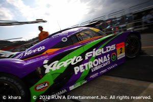 幸い午後に向け天候も回復(した様に思われた・・・)、晴れ間も出てきてアタック用タイヤを日なたに出し、僅かでも温めめる事ができるほどになった。オンタイムで予選開始。コースは乾き、迷うこと無く全車スリックタイヤ、高橋選手もコースイン。タイヤに熱を入れつつ右1コーナーから左の2コーナーへ・・・と、突然前を行く4号車がスピン!アウトに避ける高橋選手2号車の左前部が軽く接触。そのまま走行を続けようとしたが、細かな振動が発生、足回りの為大事をとり、ピットイン。