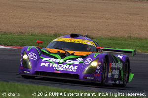 2周目には、何かトラブルが発生したと思われる66号車(アストンマーチン)がスロー走行に・・・労せず8位。3周を終え、トップ33号車(ポルシェ)2位、88号車(ランボルギーニ)以下、31号車(プリウス)、911号車(ポルシェ)、52号車(メルセデス)、3号車(GT-R)、87号車(ランボルギーニ)そして8位2号車EVA紫電と続く。この隊列は9周目まで動かず、トップとの差も約5秒と、大きく開いてはいない。 10周目に入ると500クラスが入り混じり、この混戦を利用し、3号車と87号車の順位が入れ替わる。 当面の目標が3号車に変わった加藤選手、500全車が過ぎ去ったあと3号車に肉薄。 各コーナーで詰め寄るもののストレートで離されるシーソーゲーム。 タイムは25〜26秒と予想より遅い・・・というか、トップグループも同様のペース。31号車の以外は全てFIAGT3マシン、長い給油時間を稼ぐ為もっとペースが速いと予想していたのだが・・・。12周辺りになると、25秒中盤の87号車に対し、追う3号車は24秒台も出しつつ、25秒前半・・・加藤選手も殆ど変わらぬ25秒前半。