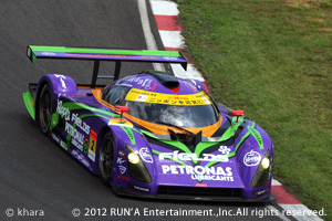 14周を終える最終コーナーから登りストレート、3号車が87号車をオーバーテイク、これに加われない加藤選手は15周目、1コーナーで87号車に急接近。続く2コーナーで、鼻先をインにねじ込もうとするが果たせず、左3コーナー立ち上がり、喰らいつくが並ぶ事はできない。 87号車の左後ろに付けてヘアピンへのブレーキングでチャンスを伺う。僅かに鼻先が入るが87号車も切り込む!!EVA紫電の右前ホイールと87号車の左後部が軽く接触!!目の前で180度スピンする87号車、フルブレーキングでストップした2号車。幸い最初の接触だけにとどまり、再スタートする加藤選手。特にマシンにダメージは無い・・・と思われたが・・・「ハンドルおかしい!!」と無線連絡、緊急ピットイン。ジャッキアップ、ピット前で点検。 外観的には右ホイールのみだが、特にガタや変形は見られないが、とりあえず右ホイール、NEWタイヤで交換、再スタート。
