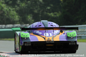 その加藤選手。計測2周 目で早くも1′22″612!と、トップタイムと思いきや、既に33号車が1′22″588をマークしており2番手タイム。そのまま、33号車はアタック終了、ピットイン。連続でタイムアタックする加藤選手。 第1セクターでベスト更新、速い!!最終コーナーから登りストレート、ダンロップブリッジに突然現れるEVA紫電。 1′22″162!! 05年のコースレコード更新。勿論トップタイム。この直後赤旗が出され、2号車は走行終了。