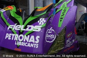 前日の設営日こそ素晴らしい秋晴れに恵まれたものの、本日のプラクティスは早朝から雨。 8月末のテストでは2日間雨予報だったので、テストスケジュールも変更となり、多くの時間は翌日ドライコンディションで走行したが、1日目のウェットコンディションでのデーターも得ておりこれらが活きる事となる。 雨は小雨が続く中、止み間もあるが、終始ウェットコンディション。タイヤはウェットタイヤ(深ミゾレインタイヤ)がメインながら、インターミディ(浅ミゾレインタイヤ)に交換するか?しないか?というコンディション・・・こうしたコンディションながら、今シーズン全面舗装改修がなされたサーキットを走った優位性はあったのか、走り出しの加藤選手は、プラクティスセッションでは常に上位タイムをマーク。序盤、1′58″784は3番手。全体にペースも上がり始め、一旦5番手に下がるものの、続く56″715は再び2番手タイム、そして56″119でトップタイム。 殆ど霧雨様なコンディションから、時折小雨になるものの、ライン上は水も履け、ドライには至らないがコンディションとして僅かづつ良くなり、各マシンタイムも上がってきたが、それに呼応するように加藤選手も一気に55″352まで再びタイムアップ、トップタイムを堅持する。 無論ここでのトップタイムは、大きな意味を持たないが、仕上がりに問題はなさそうだ。 マシンのセットアップも殆ど変更すること無く、セットが決まってきたところで高橋選手に交代。こうしたコンディションが決して得意ではない高橋選手も、57秒台と全体で15、16番手タイムをマーク。今回からノックアウト方式となった予選のQ1突破の上位16台に加われそうな勢いだ。 まだタイムを上げられそうだが、56秒台にあと僅かの57″059まで詰めたところで最終的に予選で使用するタイヤ(ソフトか?ミディアムか?)を選択すべく再び加藤選手に交代。残り時間も少なく、あと5分程で、10分の300占有走行時間になり。その300占有時間は、高橋選手に予選Q1シミュレーションを予定している。冷たい路面に慎重に周回を重ねタイヤに熱を入れアタックに入る。 1、2コーナーを抜け、第1セクターのタイムも悪くなく、完全なアタックモード。ところが3コーナーに入りところ・・・ブレーキングでタイヤがロック!!200km近い速度でコースアウト、そのままタイヤバリアに一直線!殆ど正面から激突!!幸い加藤選手に怪我はないが、マシンは全部が小破、自走不能となり回収の為赤旗となる。加藤選手が、単独でこれほどのクラッシュは・・・に限らずコースアウトは、紫電のドライブでは初めてと言っていいほど珍しいアクシデントである。 キャリアカーで戻ったマシンは前部、特に下部の破損が著しく、ピットに戻ったマシンをメカニックが診断。その結果、交換部品が足らないことが判明。外観だけならそれなりに修復可能だが、下部は見えないところながら空力的にも非常に重要で、大きな力が掛かる部分。安易な修理は重大な事故に結びつきかねない。 残念ながら、ここで完全に沈黙・・・・。と同時に、数字の上でも今年のチャンピオンは完全になくなった。次戦モテギは、公式戦としてはEVA紫電のラストラン。厳しいコースだが、名車紫電にふさわしいベストをつくした有終の美を飾らせてやりたい。