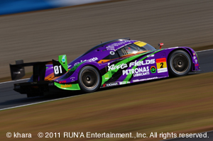 明日は雨予報だが、今日は終日晴れ、ドライ走行となるだろう。 セッション開始…しばらく待つ。 ここ茂木は、セッション開始からしばらく(マシンが走行)した後の方がグリップが増し、タイムが上がるという、コースの特性…というか経験上、わかっている(逆のサーキットもある。) グリップの悪い状態ではタイヤの損耗も大きくなるという事もあり、開始から10分以上経過してから加藤選手がコースイン。 部分的に舗装の改修もあり、ウィング、ダンパーをすこし調整しタイムアタックに入り、1′51″411! 楽々コースレコード(従来53″147)ながら8番手。 トップは911号車ポルシェ50″199、5番手まで50秒台、12番手までが51秒台。 その後、足回りの微調整を加えつつアタックを続け、51秒台で安定したあたりで高橋選手に交代。 程なく53秒台に入るものの、タイム的にはややばらつきが大きいが、自己ベストを3秒以上上回っている。 500との混走セッション終盤には53秒台前半に安定。 300クラス占有に入り、NEWタイヤでのアタックも52″810までタイムを上げるが、最終アタックに入った裏ストレートエンドの90°コーナーでスピンコースアウトを喫してしまった。 マシンは多くの砂利を積んで帰ってきたが、ダメージは無し。 まだタイムアップが期待できるセクタータイムだっただけに、残念だが、予選、決勝への期待が膨らむ走りだ。 セッションが終了した結果、2号車EVA紫電以外は、14番手まではすべてFIAGTマシンと、予想通りの勢力図、また20台のマシンが非公式ながらコースレコードを上回るという事態となり、予選、決勝共激戦が予感させる。