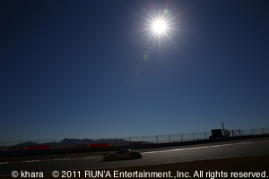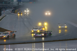 激しい水煙で、前が全く見えない第1コーナーに入る高橋選手だが、このスリッピーなコンディションではFIAGT勢が装備するABSやトラクションコントロールなど高度な電子デバイスが大きなアドバンテージとなり、オープニングラップから大きく水を空けられ21位に後退。