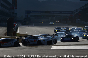 ところがスタートダッシュを決めた5番グリッドの3号車(GT-R)が88号車(ランボールギーニ)にぶつかり、トップ集団は大混乱。