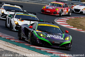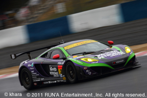 フリー走行から決勝レースまでの間、日射しはあるが、小雨もパラつき、時折強い風が吹き、またサーキット上空は爽やかな青空をだが、周辺の山々は厚い雲に覆われ、周辺地域ではかなりの雨が降っているらしいとの情報も入るなど、予想が難しい天候。 しかし決勝レース直前のウォームアップ走行時では、完全ドライコンディションとなった。 2013年シーズン開幕戦、NEWマシン「エヴァRT初号機アップルMP4-12C」のスタートは高橋選手。 ウォームアップ走行では満タンながら、35秒台から33″442までタイムを上げ6番手と好調。 マシンに慣れるに従い、レースではまだまだタイムアップは可能だ。 定刻の午後2時、フォーメーションラップが開始されるが、隊列が整わず2周のフォーメーションの後、開幕戦スタート。 オープニングラップをポジションキープの12番手で通過した高橋選手、2周目32秒台、3周目ポジションをひとつ落とすものの、混戦の中団グループ中、32秒台と良いペースだ。 更に4周目の31″674のベストタイムをマークし、5周、6周目と31秒台を連発し、トップグループと遜色ないタイムを刻む。