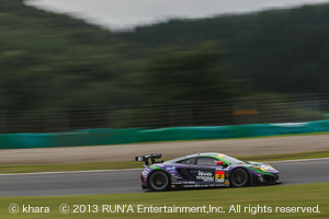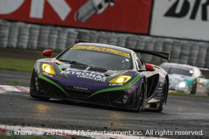 64周目、500のワンツー2台が後ろから迫り、レインボーコーナーで「エヴァRT初号機アップルMP4-12C」加藤選手を左右から追い抜く際に、サンドイッチ状態で衝突!!幸い?ダメージは外装だけにとどまりレースは続行できたが、ヒヤリとした場面であった。