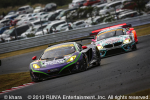 10周辺りを過ぎると、タイヤキャラクターの違いか?上位グループの中から大きくタイムを落とし、中位グループに飲み込まれるマシンも現れる。そうしたマシンを、51〜52秒台で飛ばす加藤選手が飲み込み、11周目には9位、13周目8位、16周目には7位へと上がり、トップ3号車(ポールポジション:GT-R)とは既に45秒差だが、中位グループの中で確実に順位を上げている。
