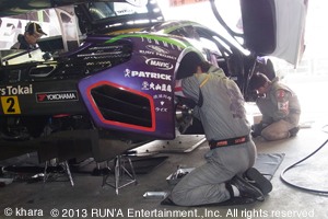 昨日予定されていた予選は、雨によるコースコンディション不良、更に濃霧での視界不良のダブルパンチでキャンセルとなった為、通常であれば決勝レース当日、午前中に予定されたフリー走行の時間が、予選セッションに充てられる事となった。 しかし、未明までの雨で、コースにはまだウェットパッチが各所に残り、ドライ用スリックタイヤか?インターミディ(浅溝レインタイヤ)か?現状でもタイヤ選択が難しいところに加え、やや強い(ストレート上では)向かい風が路面を乾かすかと思えば、霧雨も感じられ、空にも厚い雲が控えている等、不確定の要素山積みの中、予選時刻の午前9時を迎える。 今回の予選は、通常のノックアウト方式(1回目Q1予選タイムの上位13台が、2回目Q2予選に進み、上位グリッドを決める。)では無く、GT300、500クラスそれぞれ25分間づつ1回の専有走行、ドライバーは2名どちらか1名のみでも、両ドライバー共にドライブしてもどちらでもかまわない、久々のガチンコ予選である。タイヤもNEWタイヤが2セット使用可能。ただし、それぞれのセットいずれかが、予選終了後の抽選で決勝スタートタイヤとなる為、予選一発勝負でソフトタイヤを使ってタイムを出しても、それがスタートタイヤとなった場合、レースを失う事にもなりかねない。2セット目をどこで投入するかも重要で、タイヤが充分温まらなければ不発となる。 午前9時予選開始、61号車(BR-Z)のインターミディ以外、全車スリックタイヤでコースイン。全車ファーストレーンを走り去った後、ゆっくりとピットを後にした「エヴァRT初号機アップルMP4-12C」加藤選手。陽射しのない曇り空、20度と低い路温、ウェットパッチがまだ残るコースだが、雨は無さそうなので、セッション終盤でコースコンディションは良くなると思われる。 アウトラップから徐々にペースを上げ5周ほどウォームアップ、6周目のアタックは1′50″764!!暫定6位、翌周クールダウン。 残り時間10分、2セットを投入するには時間的にリミット。多くのマシンは2セット目に履き替えている。ここでNEWタイヤに代えて充分なグリップを発揮するか?どうか?微妙なところ・・・判断はステアリングを握る加藤選手に委ねられ、「ここままで行く」こととなった。 その間に11位に下がるが8周目の再アタック!!49″557とタイムアップ、6位に再浮上!!もう1周、前との間隔を空けクリアラップを作り3回目のアタックに入ったが、コース中盤、第2ヘアピン後のダウンヒルストレート(オートポリスはストレートやコーナーに特に呼び名がない)加速中、突然エンジンが吹けなくなってしまった。 ここぞ!いうところでピットに戻らざる得なくなってしまい、ここで予選を終える。結局この後、他のマシンもタイムを上げ、予選は15位・・・。 8月のテスト走行では、まだエンジンが本調子でない中、47秒台をマークしていた事を考えると、よりコンディションの良くなった今回の予選、十分シングルポジションが狙えるだけに悔しい結果となった。 トラブルの原因は程なく分かり、エアインテークの(ターボの加給圧がかかった)ホースが外れてしまったようで、修復は可能だが、狭く手の入り難い場所の為、時間がかかり予選後のサーキットサファリの走行ができなくなってしまった。 このサファリで走行を予定していた高橋選手、未だ走れず・・・。