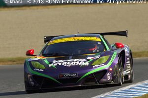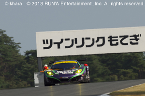 この最終戦モテギは、2つ、シリーズ戦と異なる事がある。通常シリーズポイントの2倍の「kg」ウェイトハンディが積まれるが、この最終戦では、それが全てゼロになる。(前戦オートポリスはシリーズポイント分の「kg」)早い話が、今シーズン強かったマシンが、より速くなるのであり、残念ながら、今シーズンの我々には殆ど関係無い話である。(3ポイント=3kgは降ろせる。) もうひとつは、レース距離が250kmとシリーズ戦では最も走行距離が短いのである。この短さから、チームによってはタイヤ2本交換として、ピットストップ短縮を狙う事だろう。だが2号車「エヴァRT初号機アップルMP4-12C」は更に奇策としてタイヤ無交換作戦をとる。またこの距離なら、スタート時に燃料を満タン(実際には計算により満タンよりやや少ない)でスタートすれば給油時間も短くできる。ピットストップで必ず行わなくてはならないドライバー交代は15〜17秒、これはいくら練習しても大幅に短縮はできないので、その間はしっかりと給油のみに当て、最も短いピットストップにする事ができるのである。 フリー走行後には両ドライバーが交代練習に励んでいる。昨年までの紫電はいつも給油時間が短く、タイヤ無交換作戦を取る事も多かったので、ドライバー交代タイムはかなり重要だったが、今年は常に給油時間が長く(約30秒前後)、交代にも十分余裕があった。早い交代の勘を取り戻すべく、幾度と無く交代練習をし、最終的には納得の行く時間にまで短縮する事ができ、決勝レースへの準備は整った。 決勝レースはいつもと異なり30分早い13時30分スタート。レース終了後の年間表彰や全ドライバー参加のグランドフェイナーレ等イベントが遅くなると、日没が早くなった事と相まって、冷え込みも厳しくなる。その為の、ファンへの配慮である。 スタートドライバーの加藤選手が、ウォームアップ走行を終え、セット変更のリクエスト、車高を若干調整。テストデーターのないサーキットだけに、試しておきたい点も多々あるが、決勝レース直前とあっては多少バクチ的な点も否めない。薄曇とはいえ、気温20度前後、寒さを感じるほどの事はないすごし易い陽気で始まった決勝レース。オープニングラップで12位から13位、3周目には14位そして、翌4周目には16位へ序盤から大きく順位を落とす。直前の車高調整で“少し”アンダーステア方向にしたのだが、行き過ぎたようでアンダーステアとの格闘中ドンドン抜かれて行く。とは言え、トップ3台、11号車(メルセデス)、61号車(BR-Z)16号車(CR-Z)はドンドン先行するが、4位から加藤選手の16位まで13台が10秒以内に入るグループを形成し53〜54秒でレースが進む。 15周を過ぎるとルーティンピットも始まり見かけ上の順位は上がっていく。やはり殆どのチームがタイヤ2本交換でコースに復帰して行くが、タイヤが冷えているアウトラップのロスはまぬがれない。それに対して周回を重ねる毎に燃料が減り、これが功を奏し強いアンダーステアも解消され、タイヤの磨耗が進んでいると思われるが全くタイムの落ちない加藤選手・・・どころか、29周目にはベストタイム52″691をマーク!翌30周目も52秒台と他のマシンピットインに伴い、見かけ上の順位ではなく実質順位も上がってきているのである。 23周目「残り10周(33周ピットイン予定)ですが、タイヤどうです?」との渡邊エンジニアの無線に「大丈夫!!大丈夫!!」と応える加藤選手・予定通りタイヤ無交換作戦決行である。 33周を終え、見かけ上の順位が3位になってピットイン。加藤選手から高橋選手に交代。給油時間は17秒。この間にドライバー交代を終え、すぐスタートできれば計算上8位辺りで復帰でき、タイヤもそのままなので、交換時のアウトラップのロスも少ない。だが給油を終えても、まだドライバー交代が完了していない・・・というか、ドアは閉まったがまだ発進できない。僅か3〜4秒とはいえ、接戦中では順位を落とすに十分なロス。 コースインした時点で10位。ところがアウトラップ、12位にドロップ!!タイムも他の多くのマシンのアウトラップに比べ5秒以上遅い。その後2周に渡りタイムは上がらず、2分00秒台、順位も35周目14位、36周目17位と目を覆いたくなるほど落ちて行く。 渡邊エンジニアも「何かマシンの調子がおかしいですか?おかしいようならピット入ってください!」と心配するほど・・・。だが特に何かトラブルを抱えているわけではなさそうだ。その後59秒台から57秒台、そして終盤47周を過ぎた辺りから56秒台に入るが、既に17位〜18位で推移・・・50周を終え17位でチェッカー。 プラクティス、フリー走行では十分なタイムを出していた高橋選手だが、レースになったら完全にリズムにのる事ができず低迷。直前のセッティング変更や、タイヤ無交換が裏目に出たのか?だが高橋選手は、同じマシンに乗って、加藤選手が出せるタイムを、自分が出せない事をマシンの性にはしない「完全に自分が悪い。」と反省の弁。 現在、SUPE