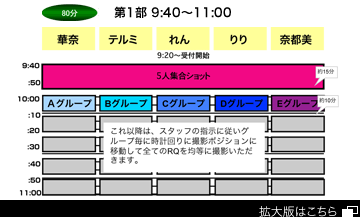 初めの15分間をRQ5人の集合カット撮影タイム。その後は、懇親会としてRQからのメッセージ、 賞品をかけたシンクロじゃんけんなどお楽しみいただいた後、最後にサイン会を行う予定です。