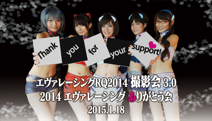 撮影会第4部の後に、2014年度のエヴァレーシングを支えていただいたファンの皆様への感謝の気持ち“ありがとう”をお伝えするためのイベント「エヴァレーシング ありがとう会」を実施いたします。エヴァレーシングRQの5人と一緒に、2014年の想い出を振り返るトークショーやゲーム大会でパーティーを楽しんでいただきたいと思います。軽食・ドリンクをご用意してお待ちしております。