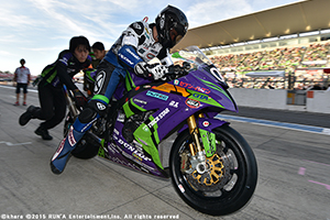 出口選手、フリー走行での転倒で骨折などはなかったが、腰を強打しており、マシンも傷ついた完璧には程遠い状態で懸命に走行を続け作戦通り24周を消化し14番手でピットに戻ってくる。