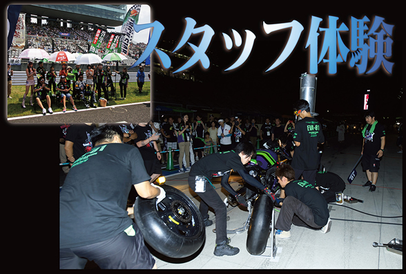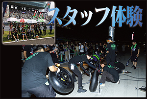 鈴鹿8耐当日に鈴鹿サーキットにおいてエヴァレーシングチームスタッフを体験できる2つの特典が受けられます。マシンを身近で見学したり、レース直前の熱気を最も間近で感じることができます。これに関わる鈴鹿8耐チケットは全てご用意させていただきご自宅へお送りいたします。