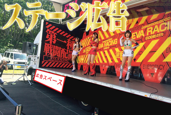 鈴鹿サーキットグランプリスクエアにて開催するエヴァレーシング トラックステージのスポンサーになれる権利です。ステージの前面の約210cm×60cmのスペースを広告スペースとして使用することが出来ます。こちら企業様、個人様問わず広告スポンサーを募集しています。
