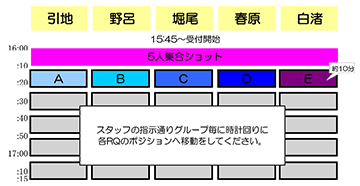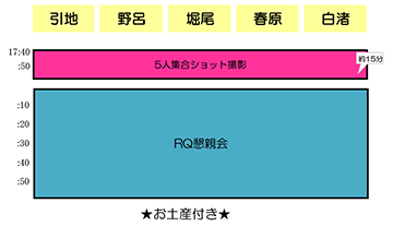 初めの15分間をRQ5人の集合カット撮影タイム。その後は、懇親会としてRQトーク、 賞品をかけたシンクロじゃんけんなどお楽しみいただいた後、最後にサイン会を行う予定です。